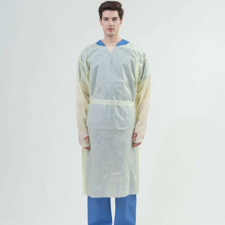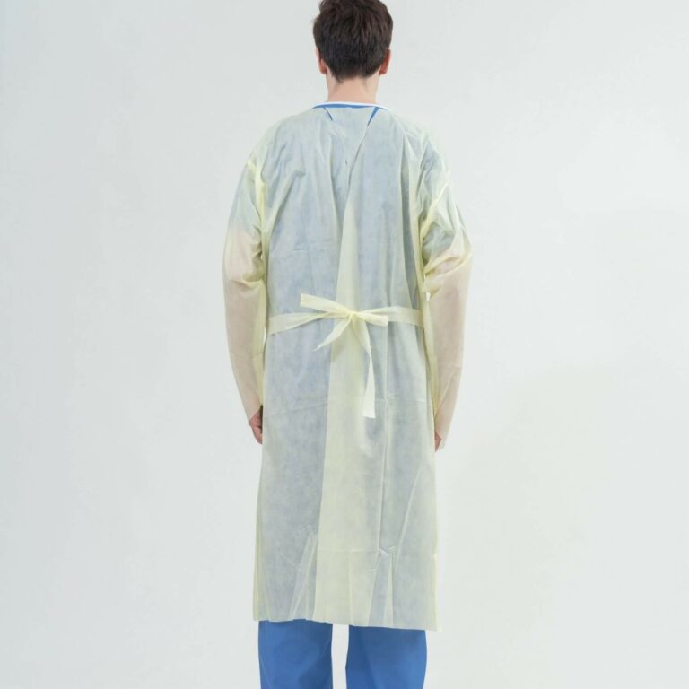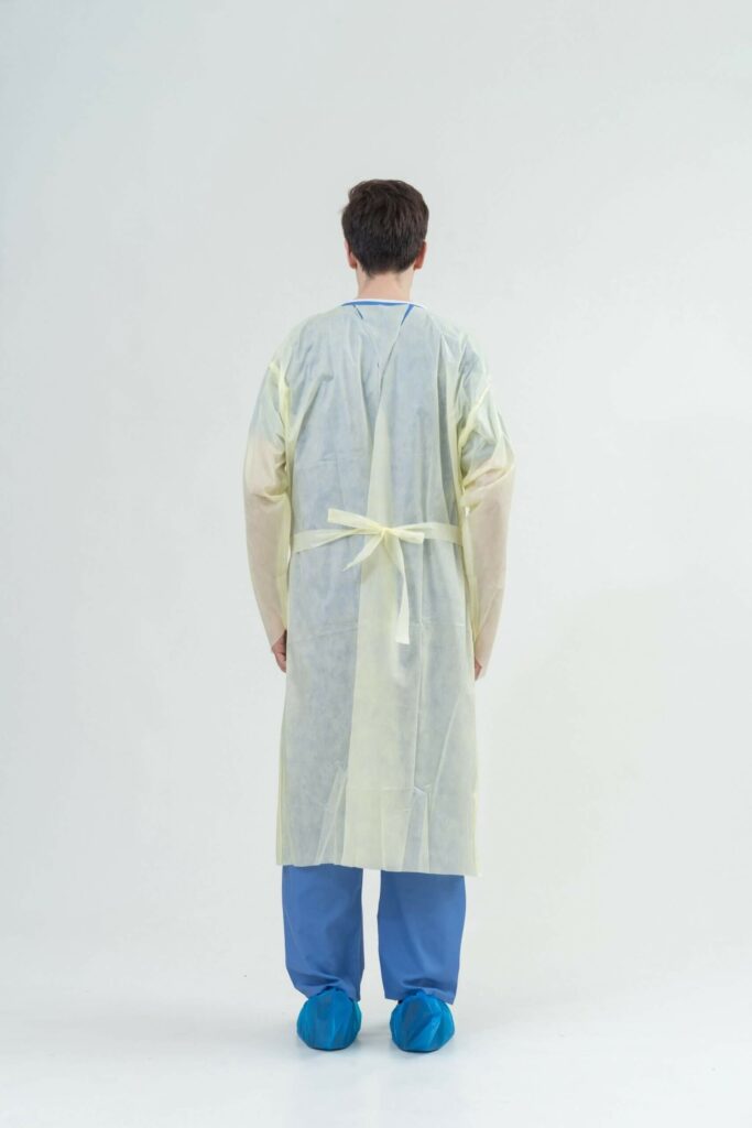 [แพ็ค 100 ชิ้น]ชุด PPE Isolation gown สีเหลือง 22 กรัม มาตรฐาน EN14126 ชุดป้องกันเชื้อโรค ไวรัส ละอองน้ำ ฝุ่นละออง