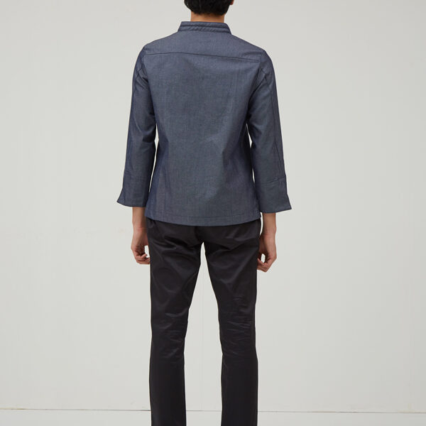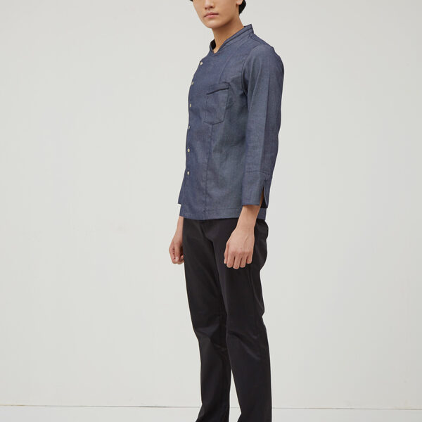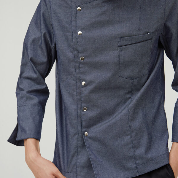 เสื้อเชฟแขนยาว แบบกระดุมกด มีกระเป๋าเล็กที่หน้าอก ทำจากผ้าโพลีเอสเตอร์ 65% ฝ้าย 35%