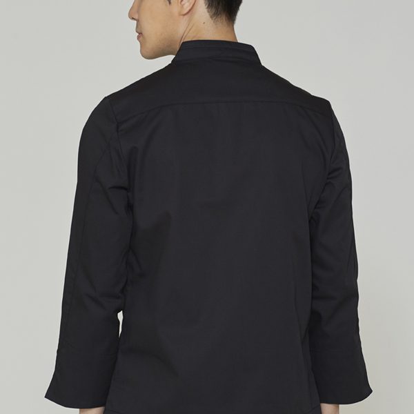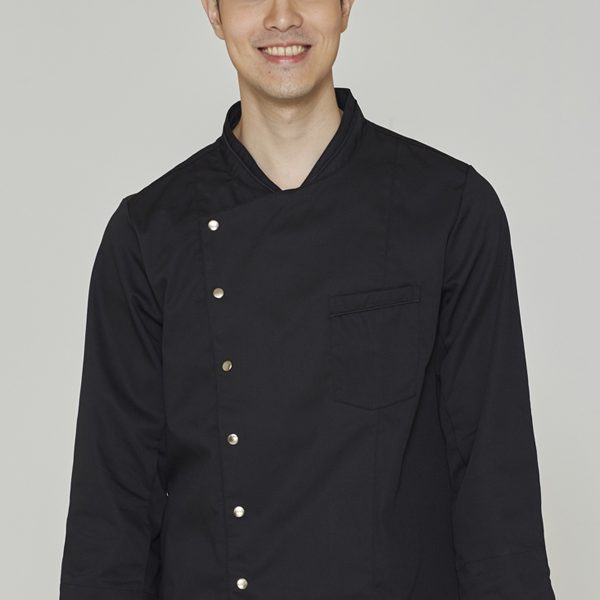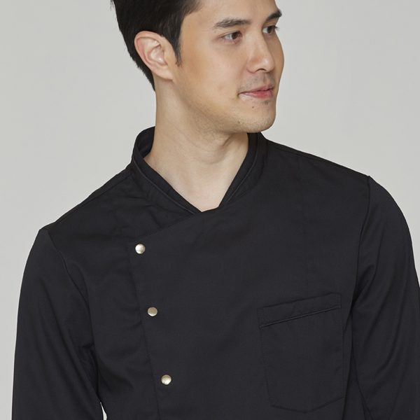 Longsleeves Black Chef Coat with press buttons and small pocket on left arm.