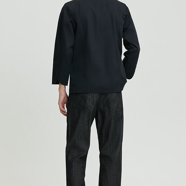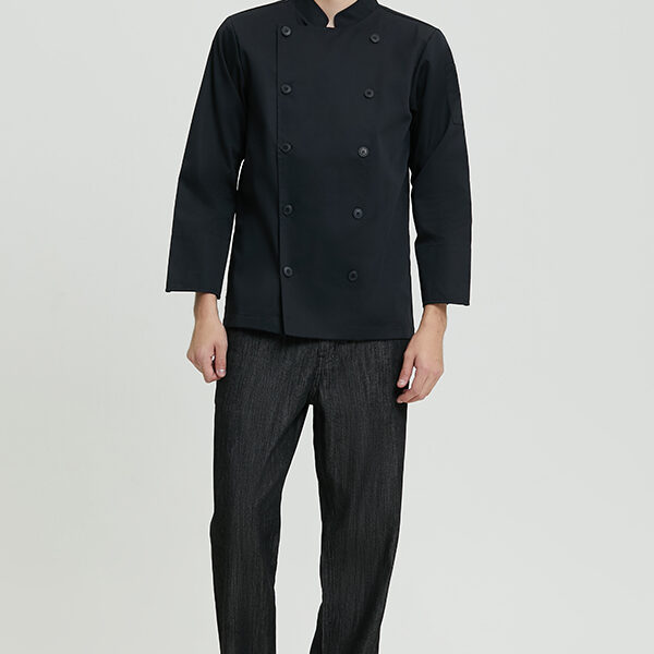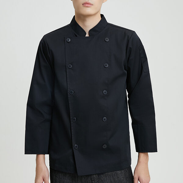 Long sleeves chef jacket with buttons and small left arm pocket Made from 65% polyester 35% cotton